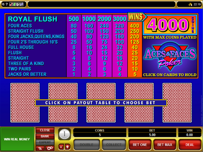 La principale différence entre le vidéo poker Aces and Faces et toutes les autres, c'est qu'il fournit un paiement exceptionnellement élevé pour les mains composées d'un Carré, en particulier lorsque les As ou les autres cartes à faces composent ce Carré. Cela modifie légèrement l'échelle des paiements, et même si les individus reçoivent toujours un paiement en even money pour une paire de Valets ou Mieux (Jacks or Better), ceux liés à la Quinte, à un Flush et à un Carré ont été quelque peu réduits. L'autre nouvelle touche particulière au niveau de cette version, c'est que les utilisateurs pourront profiter de la fonction « Double ». En fait, à la fin de chaque main gagnante, les joueurs pourront choisir ou non de prendre un risque et détermineront si une carte sera supérieure ou inférieure à celle qui leur est révélée. S'ils gagnent, ils doubleront leurs revenus. Toutefois, en cas de perte, tous les gains seront perdus, et le joueur devra à nouveau cliquer sur « Deal » pour un nouveau pari.