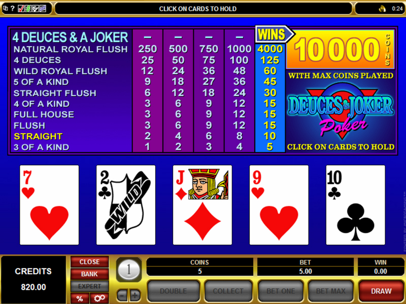 Le vidéo poker Deuces and Joker du logiciel Microgaming est un jeu gratuit sans téléchargement requis. Les nouveaux joueurs de cette variante spécifique peuvent donc apprendre les différences entre les règles et les paiements, sans avoir à risquer une partie de leur argent durement gagné. Pour commencer, ce titre progresse comme tout autre jeu classique de vidéo poker. En effet, les joueurs choisiront un montant pour leur pari, cliqueront sur « Deal » et recevront cinq cartes. Ensuite, parmi les cinq cartes reçues, ils détermineront celles qu'ils veulent conserver et celles à échanger, ce qui leur permettra de construire les mains les plus fortes et qui ont les valeurs les plus élevées. Bien entendu, chaque nouvelle variante vient avec une nouvelle série de règles et de tables de paiement, et tout ceci doit être bien compris par le joueur avant qu'il n'effectue le premier pari.